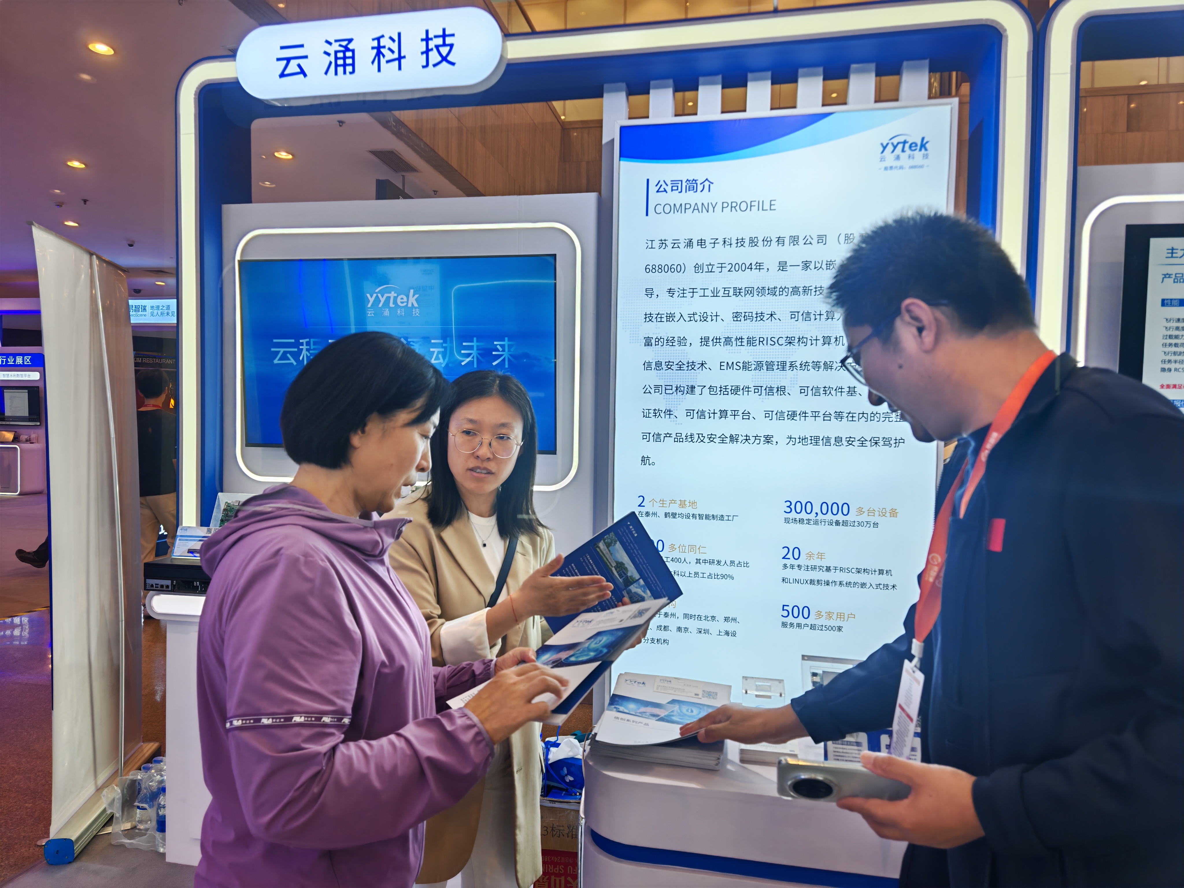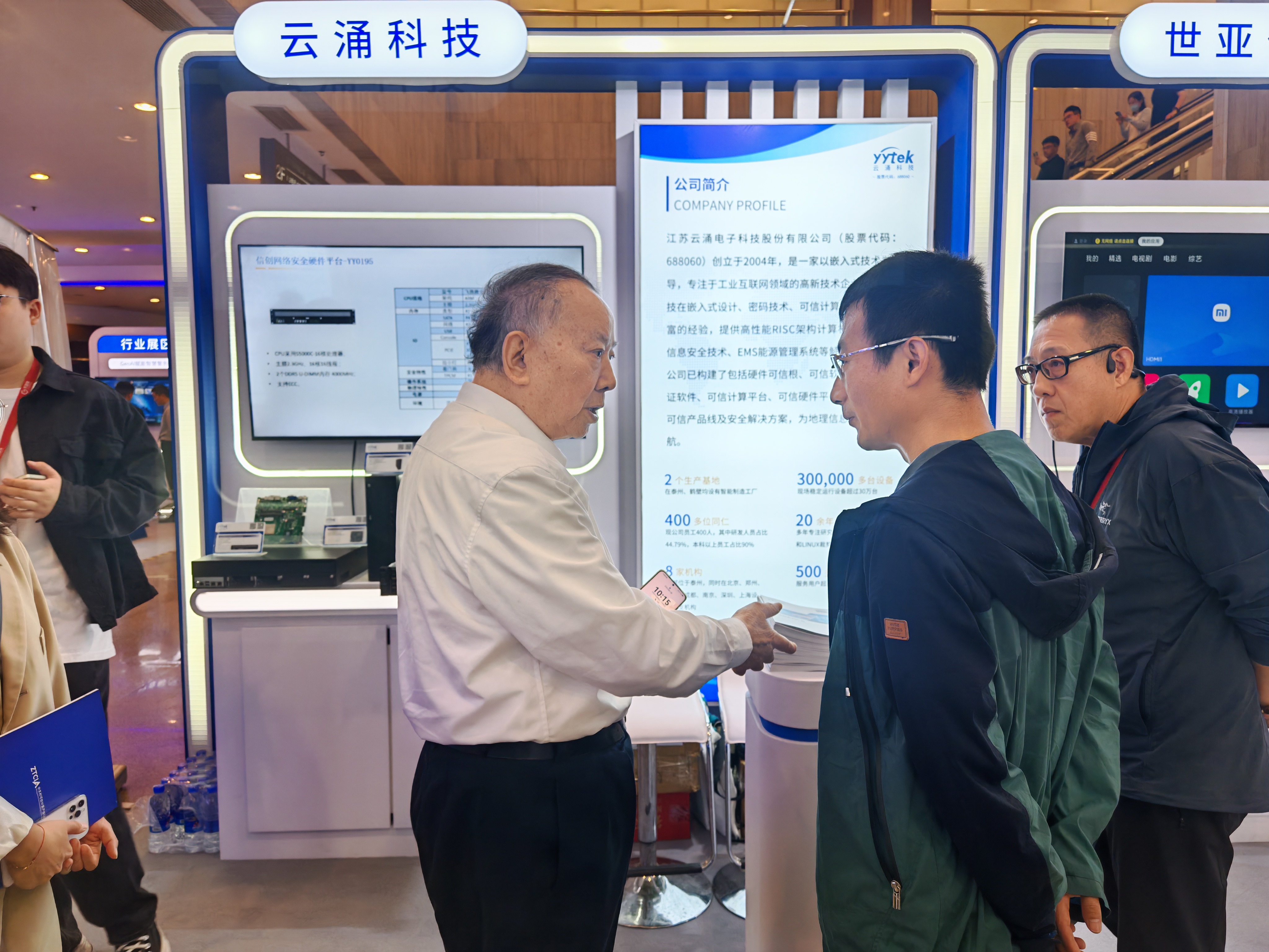 在展會現(xiàn)場,云涌科技展臺集中展示了覆蓋 “硬件可信根 - 可信平臺 - 行業(yè)應(yīng)用” 的全鏈條硬件產(chǎn)品體系。核心展品包括具備密鑰生成與身份認(rèn)證功能的可信模塊、支持多系統(tǒng)架構(gòu)的PCIe 可信卡,以及基于飛騰、龍芯等國產(chǎn)芯片打造的系列終端與服務(wù)器產(chǎn)品 —— 從適配輕量化場景的飛騰 E2000Q 瘦終端,到滿足高密度計算需求的飛騰 S5000C-64 可信服務(wù)器,再到面向網(wǎng)安領(lǐng)域的飛騰 S5000C-16 可信硬件平臺,為地理信息技術(shù)創(chuàng)新提供安全可靠的硬件支撐。其中,基于飛騰 D3000 的 PC 主機及主板、龍芯 3A6000 系列主板等產(chǎn)品,通過可信技術(shù),實現(xiàn) “計算 + 保護” 雙體系結(jié)構(gòu)的主動免疫防護,可有效抵御未知惡意攻擊,完美契合大會 “地理可信空間建設(shè)” 核心議題。?